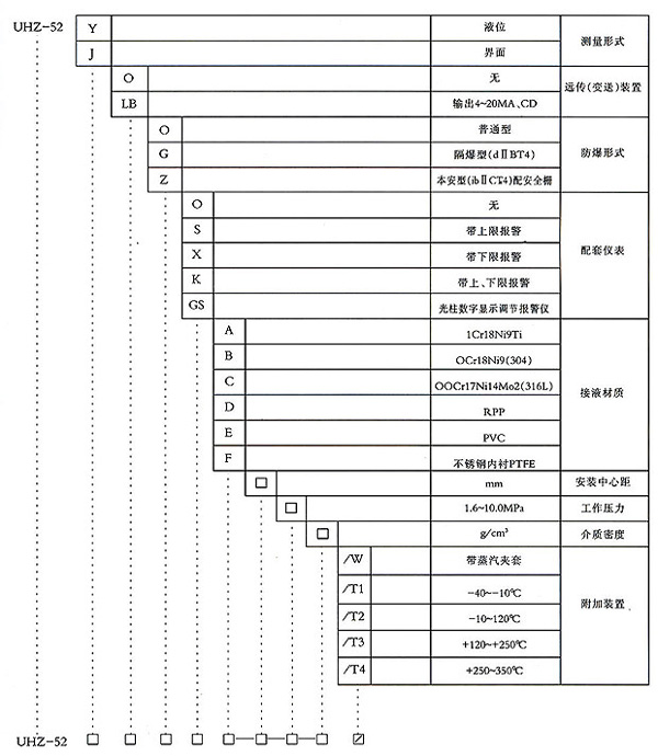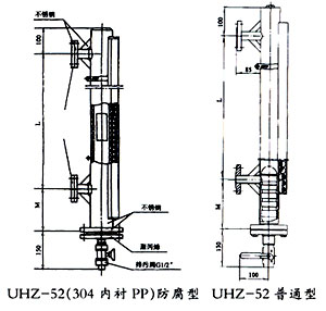 UHZ-52系列磁翻柱浮子液位計(jì),是本廠引進(jìn)、國(guó)內(nèi)外同類產(chǎn)品,并加以吸收、消化、提高,按原化工部頒布的磁性液位計(jì)標(biāo)準(zhǔn)HG/T21584-95研制生產(chǎn)的產(chǎn)品?捎糜谒、罐、槽、球形容器和鍋爐等設(shè)備的介質(zhì)液位檢測(cè)。該系列磁性液位計(jì)可以做到高密封、防泄漏適應(yīng)于高壓、高溫、腐蝕性介質(zhì)的液位測(cè)量,使用可靠、安全性好,它彌補(bǔ)了玻璃板(管)液位計(jì)指示不清晰,易破碎的不足,不受高、低溫度劇變的影響,不需多組液位計(jì)的組合。全過(guò)程測(cè)量無(wú)盲區(qū),顯示醒目,讀數(shù)直觀,測(cè)量范圍大。特別是現(xiàn)場(chǎng)指示部分,由于不與液體介質(zhì)直接接觸,所以對(duì)高溫、高壓、有毒、有害、強(qiáng)腐蝕性介質(zhì),更顯其優(yōu)越性。因此,它比傳統(tǒng)的玻璃板(管)式液位計(jì)具有更高的可靠性、安全性、性、實(shí)用性。