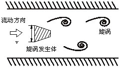 在測量管中垂直插入一個柱狀物時,流體通過柱狀物兩側(cè)就交替地產(chǎn)生有規(guī)則的旋渦(如圖所示),這種旋渦列被稱為卡門渦街?ㄩT渦街的釋放頻率與流體的流動速度及柱狀物的寬度有關,可用下式表示: |