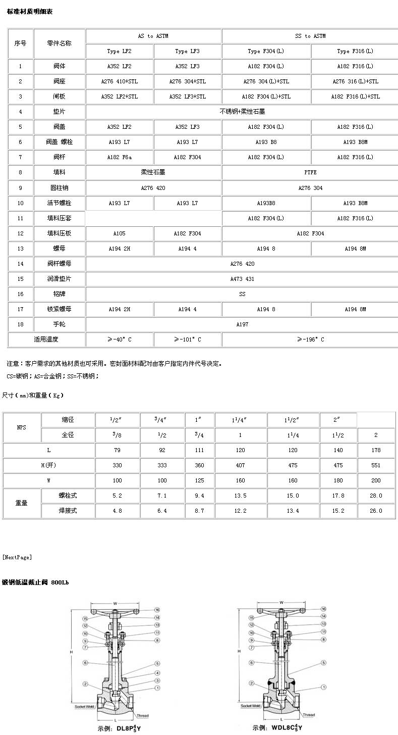 雙正低溫閘閥、截止閥、球閥符合 API602,MSS-SP-118和BS6364。檢驗(yàn)與測試按API598,標(biāo)記按MSS-SP-25。