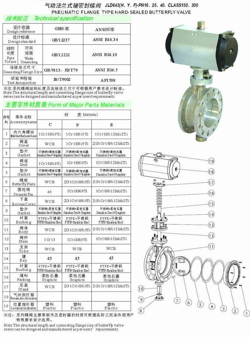 氣動法蘭硬密封蝶閥JLD643H, 氣動法蘭式硬密封蝶閥本系列蝶閥采用蝸輪傳動,操作輕便并具有自鎖功能。 應(yīng)用的三偏心結(jié)構(gòu)設(shè)計(徑向偏心、軸向偏心和角度偏心),采用的工藝方法和專用的工藝裝備加工制造,確保了零件精度和裝配精度。保證了密封付的全部錐面吻合,完全消除了密封面間的干涉與磨損。因此,開關(guān)阻力小、密封可靠、密封面磨損小,整機工作壽命長。