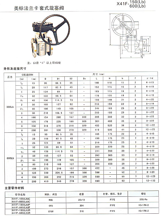 X41F美標(biāo)法蘭卡套式旋塞閥,主要性能規(guī)范 工稱壓力:150Lb、300Lb、600Lb; 適用溫度:≤ 150°C; 適用介質(zhì):水蒸汽、天然汽、油品,P:銷酸類,R:醋酸類; 材質(zhì):體蓋:WCB、CFB、CF8M,塞子:2Cr13、304、316,填料、墊片、襯套PTFE(聚四氧乙烯)