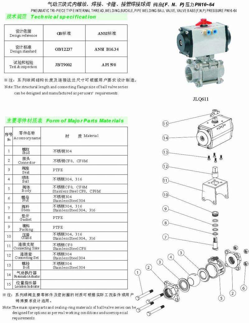 JLQ6氣動三塊式內(nèi)螺紋/焊接/卡箍/接管焊接球閥