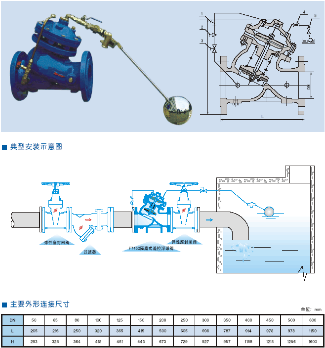 口處,當(dāng)水位達到設(shè)定的高度時,主閥由浮球?qū)Э刂脐P(guān)閉進水口停止供水;當(dāng)水位下降后,主閥由浮球?qū)чy控制打開進水口向水池注水,實現(xiàn)自動補水。液位控制精確,不受水壓干擾;隔膜式遙控浮球閥可隨水池的高度及使用空間任意位置安裝,維護、調(diào)試、檢查方便、密封可靠,使用壽命長。隔膜式閥門性能可靠、強度高、動作平穩(wěn)適用于450口徑以下的管道。